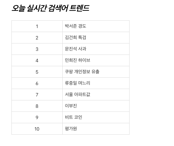 트렌드토픽 25.12.4일자 박서준 경도, 김건희 특검, 문진석 사과, 민희진 하이브, 쿠팡 개인정보 유출, 류중일 며느리 등 목차 Table of contents오늘 실시간 검색어 트렌드12월 4일, 오늘 대한민국을 달군 실시간 검색어 이슈 총정리1. 박서준 경도 (촬영지/루머 이슈)2. 김건희 특검 (정치적 공방)3. 문진석 사과 (정치권 논란)4. 민희진 하이브 (법적 분쟁/갈등 지속)5. 쿠팡 개인정보 유출 (보안 사고)6. 류중일 며느리 (가족 이슈)7. 서울 아파트값 (부동산 시장 동향)8. 이부진9. 비트코인 (가상화폐 시세)10. 평가원 (수능 성적 발표) 오늘 실시간 검색어 트렌드1박서준 경도2김건희 특검3문진석 사과4민희진 하이브5쿠팡 개인정보 유출6류중일 며느리7서울 아파트값8이부진9..