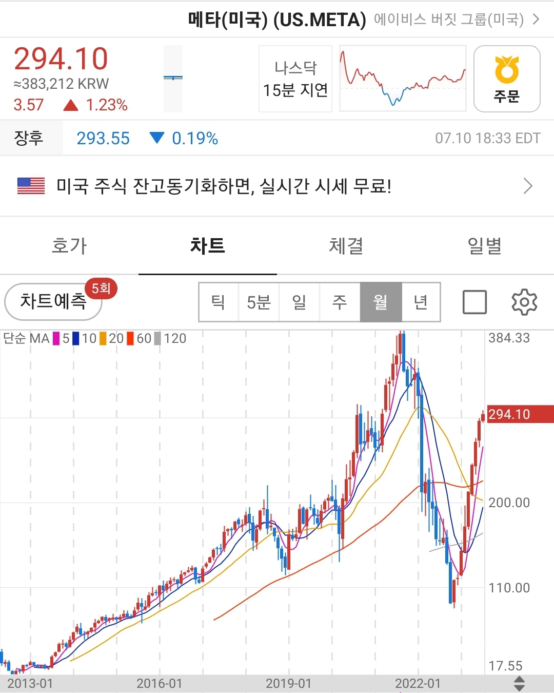 페이스북 즉, 메타플렛폼의 주가는 장 중 고점대비 오름폭을 줄였지만 1.23% 상승했다.