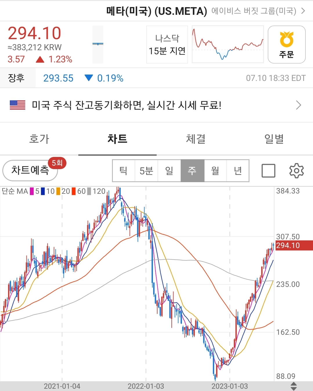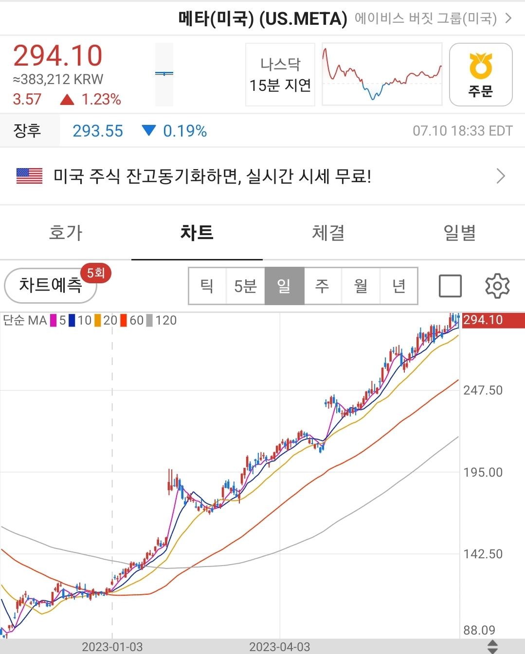 하락하던 메타 플렛폼의 주가는 비용절감, 인건비 절감을 통해 효율화를 거쳤고 주가는 이에 반응하면서 상승세를 이어가던 중에 스레드가 신기록을 경신하면서 출시 후 단 5일만에 1억명 돌파라는 역사상 기록을 경신하면서 향후 주가의 전망도 밝게 만들어줍니다.