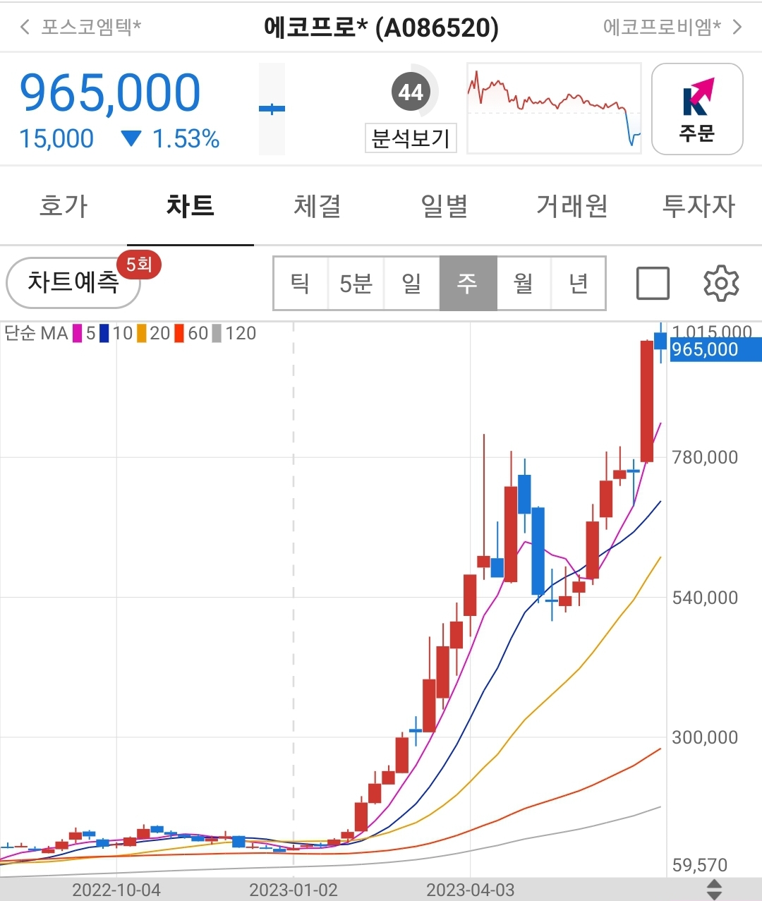 에코프로는 장 막판 이익 실현에 대한 욕구가 강해지면서 매도 물량이 나오면서 하락세로 전환하면서 종가는 1.53% 하락한 965,000원으로 장을 마감했다.