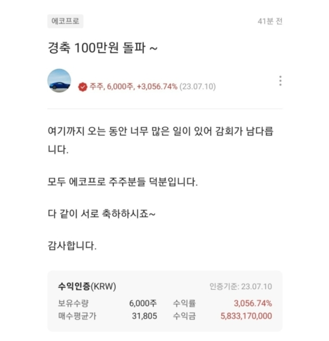 에코프로가 '역대급' 주가를 기록하면서 장중 큰 수익을 본 투자자들의 인증이 이어졌다. 에코프로 6000주를 보유하고 있는 것으로 보이는 한 투자자는 "경축 100만원 돌파"라는 제목으로 수익률 3056.74%가 적힌 자신의 주식매매 화면을 인증했다. 이 투자자의 수익금은 58억3000만원 규모다. 그는 "여기까지 오는 동안 너무 많은 일이 있어 감회가 남다르다"고 적었다.