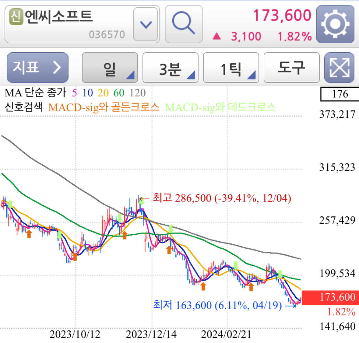 엔씨소프트 주가 차트 일봉/주봉/월봉차트