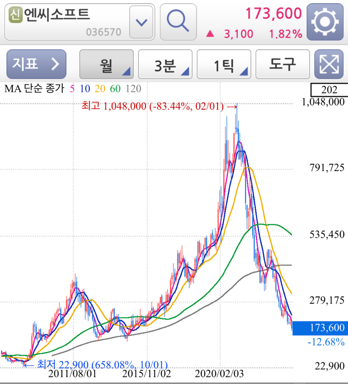 아래는 엔씨소프트 일봉, 주봉, 월봉 주가차트인데 월봉 차트보면 정말 대세 하락 추세가 강하게 이어지고 있다. 종목을 덮어두고 차트만 본다면 스캘핑 말고는 절대 중장기 진입이 불가능한 차트이다. 그만큼 엔씨소프트의 매출과 이익이 기대에 부응하지 못한다는 의미이다.