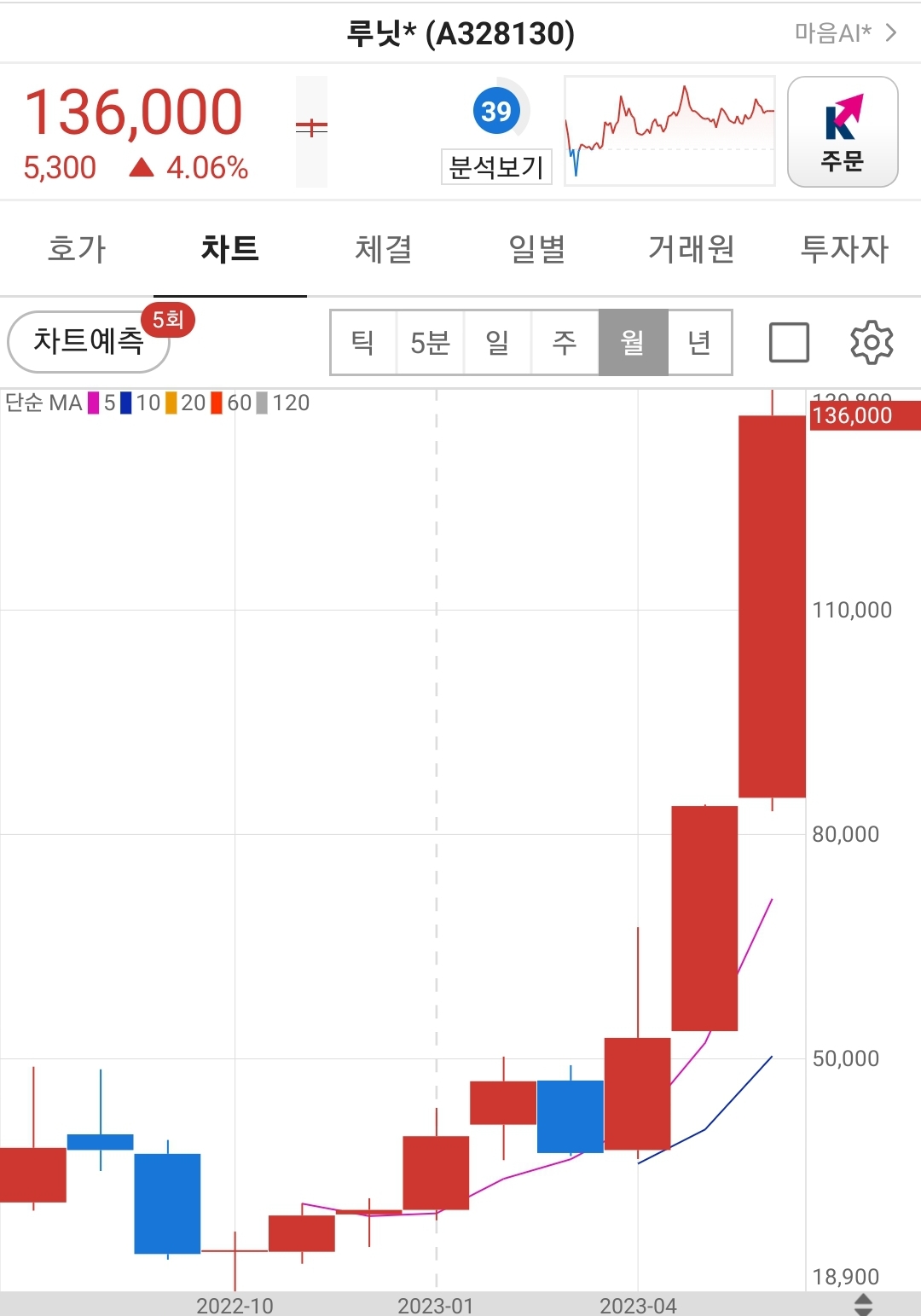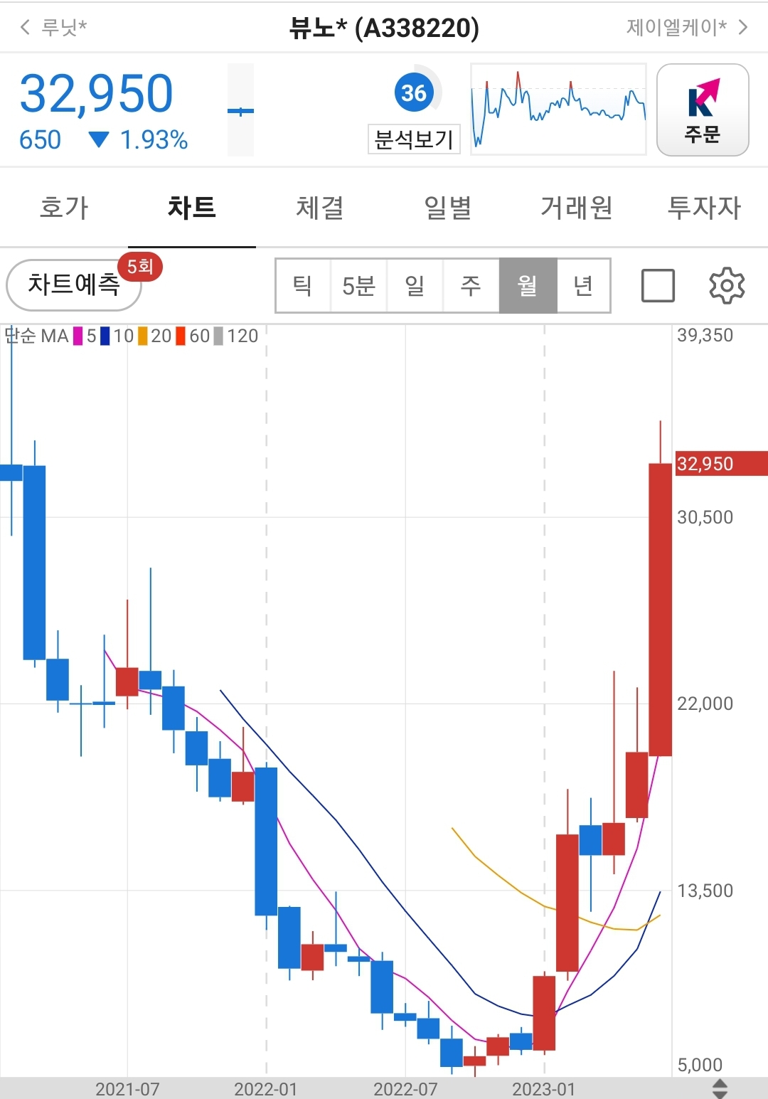 루닛의 주봉과 월봉 차트를 보면