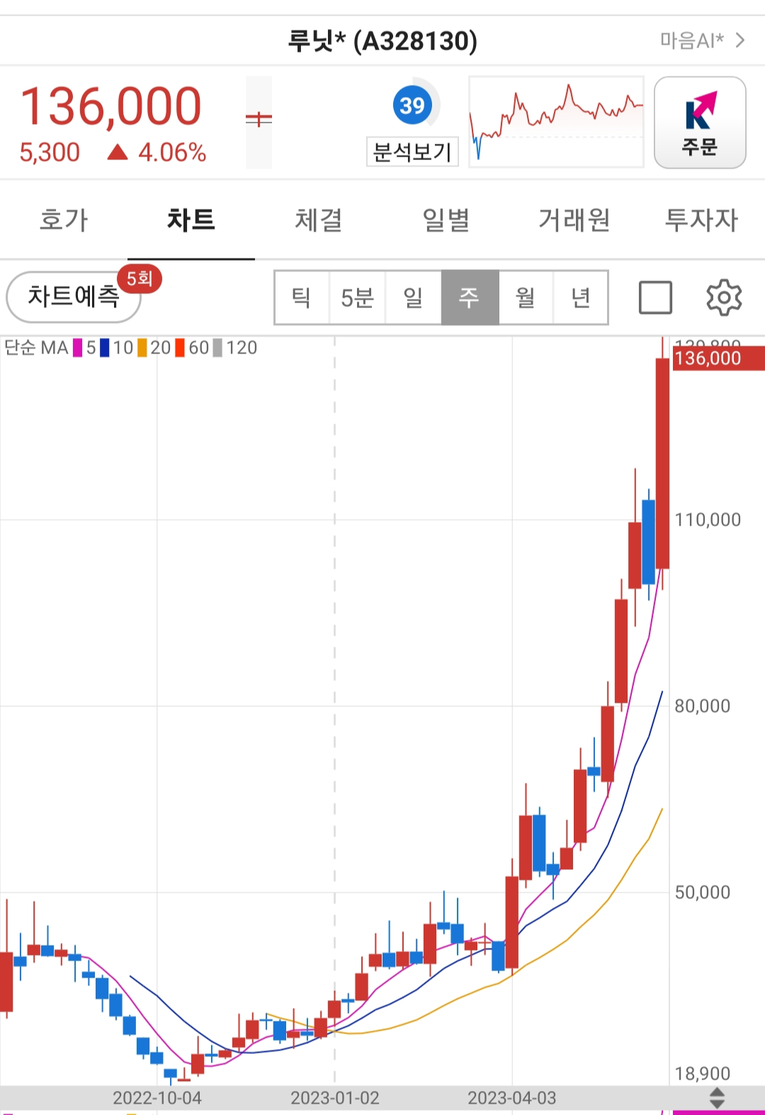 주가는 22년 10월 경 18,900원에서 136,000원까지 700% 상승하였고 장기 보유한 유저들은 소위 돈찍어내는 종목이 되었습니다.