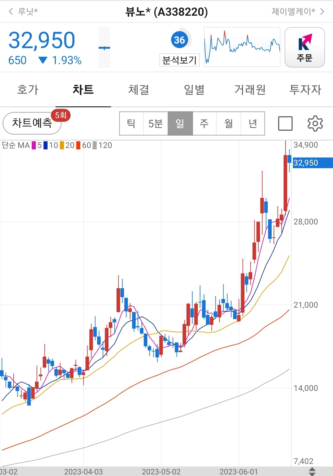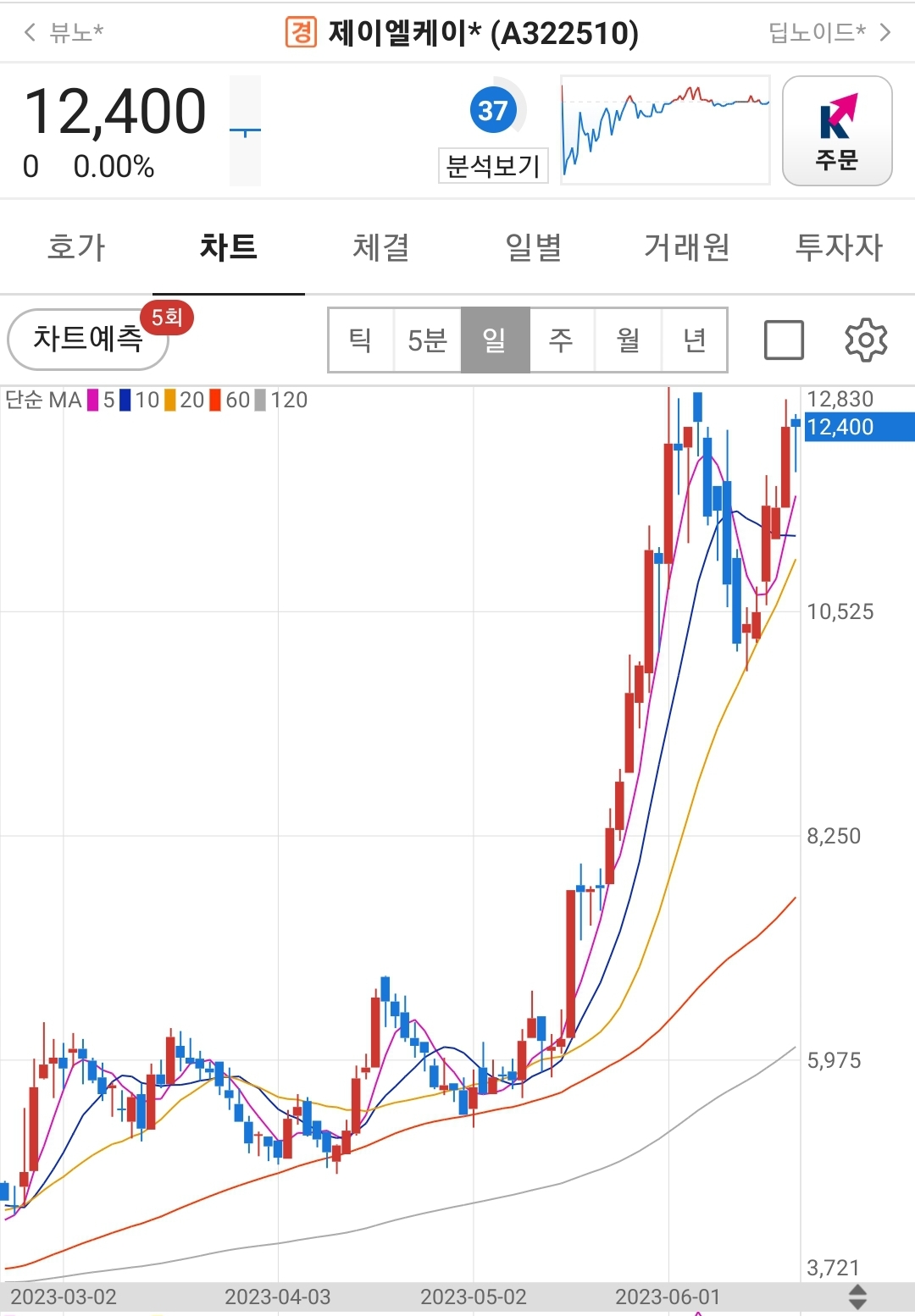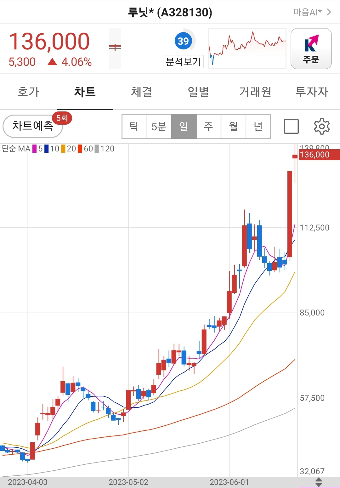 일봉상 주가차트는 60일선을 깨지 않고 우상향하고 있습니다.