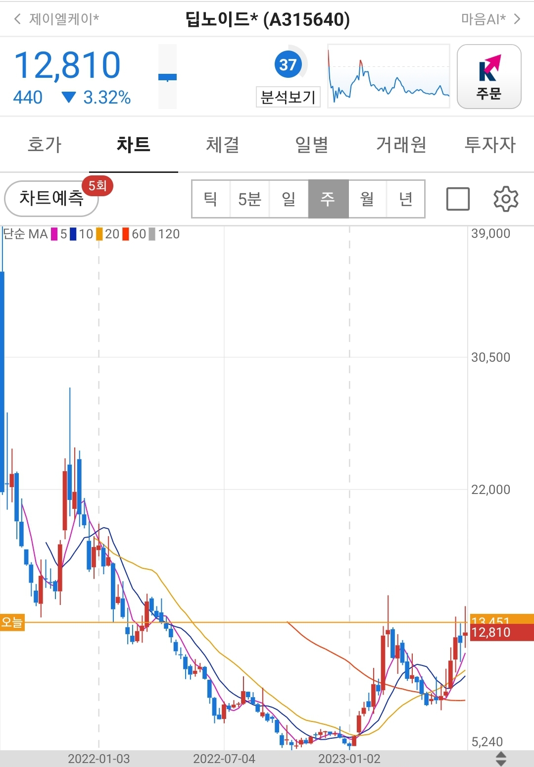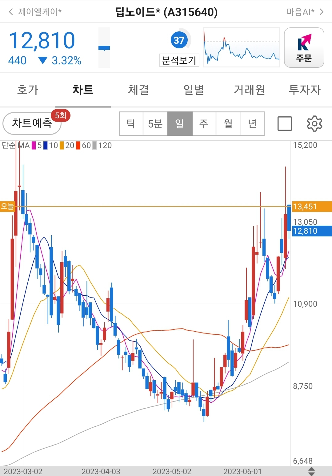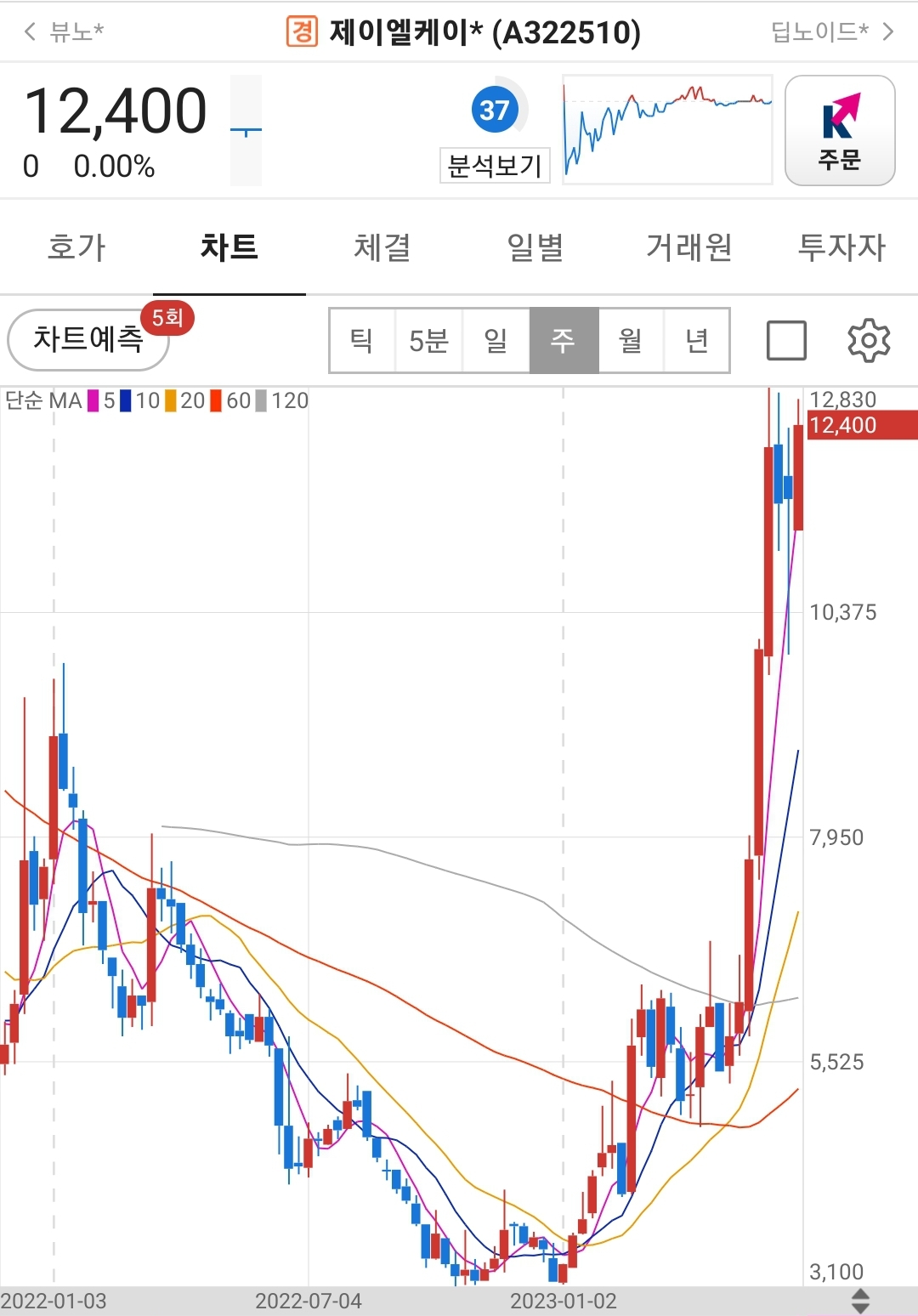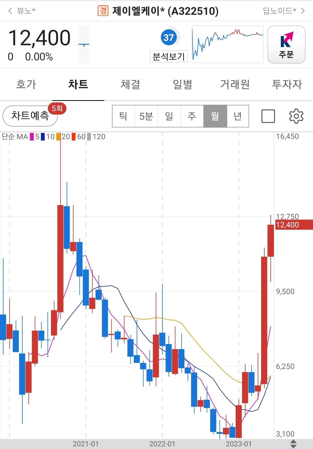 일봉상 주가차트는 60일선을 깨지 않고 우상향하고 있습니다.