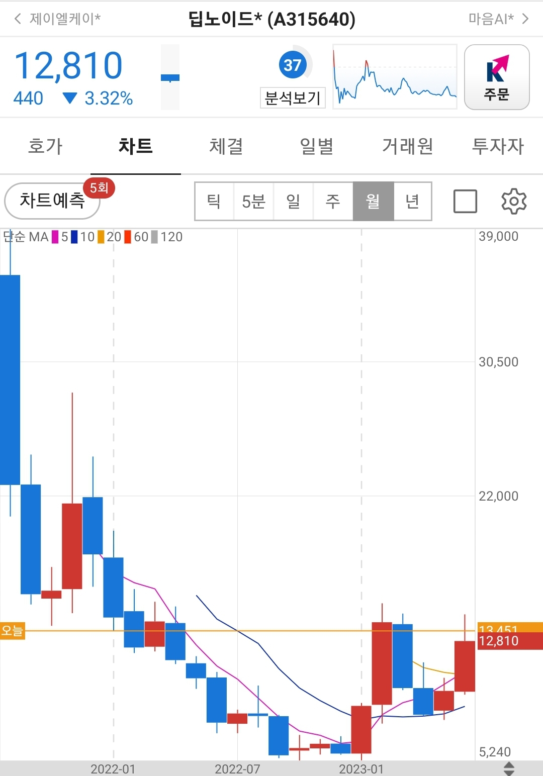 의료AI 관련 대장주인 루닛에 비해서 조정폭과 진폭이 일봉차트에서 보입니다.