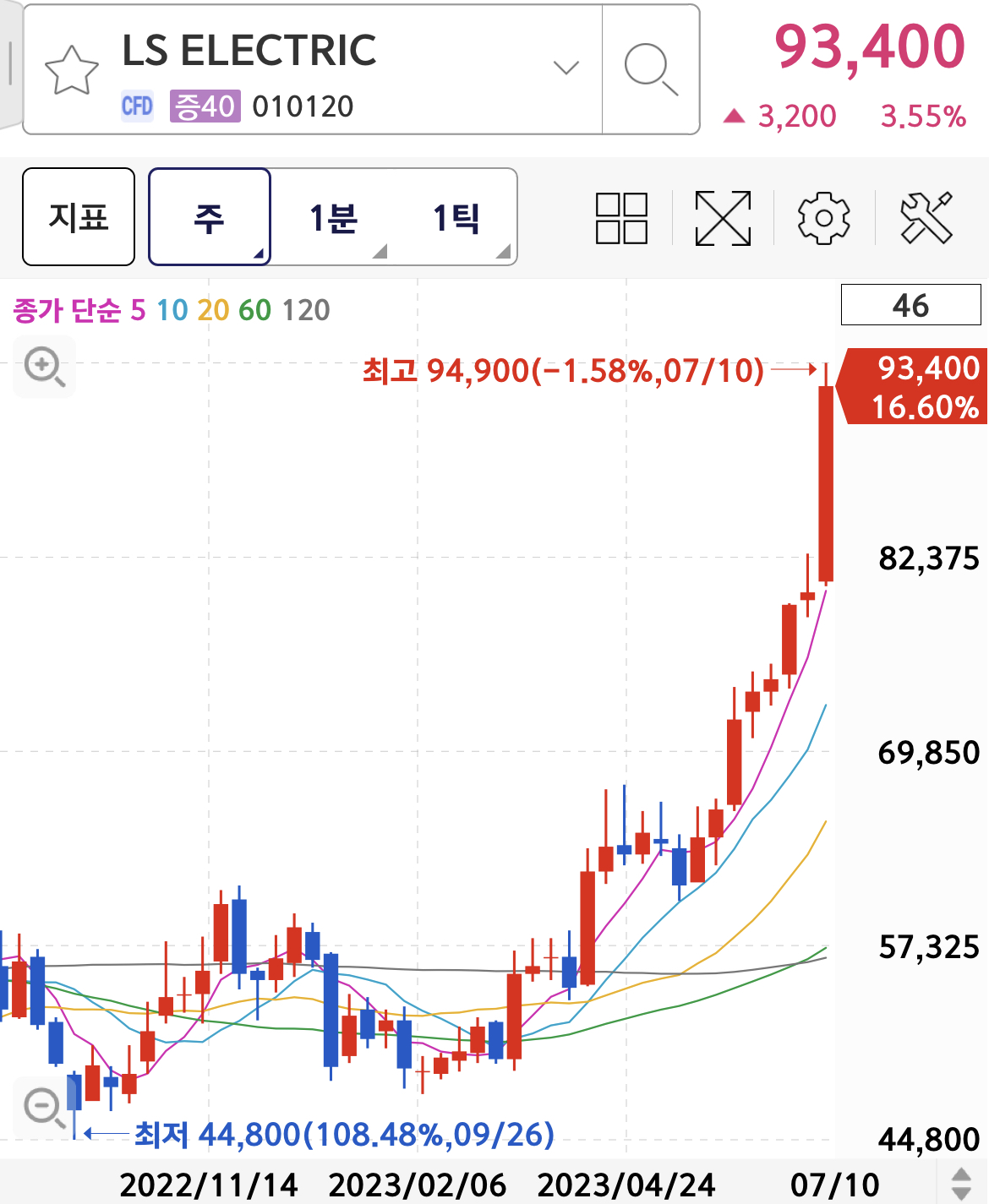 조정시에도 10일선을 깨지않고 조정받고 재상승하면서 저점과 고점을 모두 높여가는 대세 상승 추세가 이어지고 있습니다.