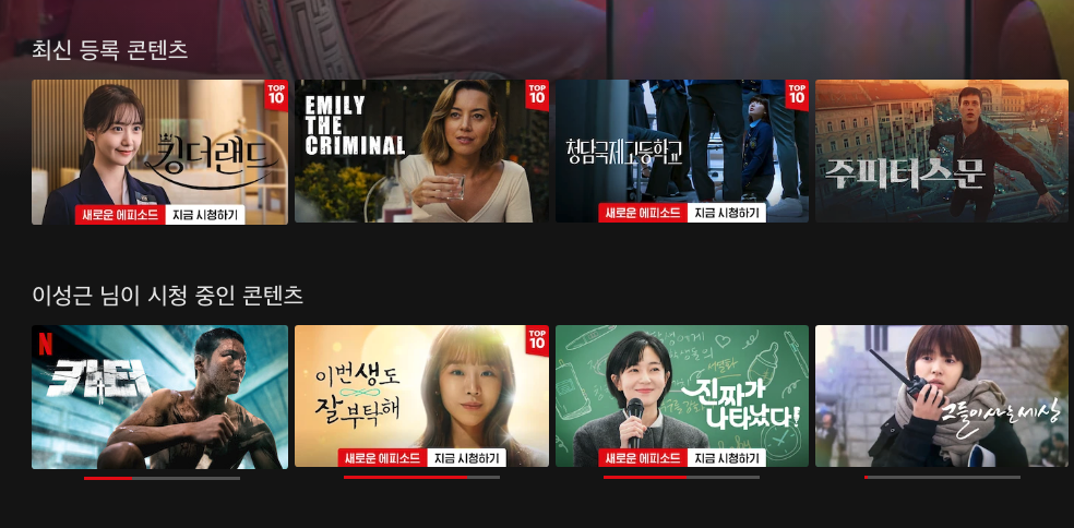 넷플릭스에 로그인을 하면 아래와 같이 최신 등록 콘텐츠에 "킹더랜드' 다시보기가 올라와 있습니다.