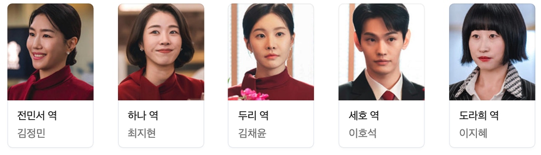 그외 오평화역의 고원희, 강다을역의 김가은, 노상식역의 안세하, 이로운역의 김재원, 구일훈역의 손병호, 구화란역의 김선영, 차순희역의 김영옥, 김수미역의 공예지, 전민서역의 김정민, 하나 역의 최지현, 두리 역의 김채윤, 세호 역의 이호석, 도라희 역의 이지혜 배우들이