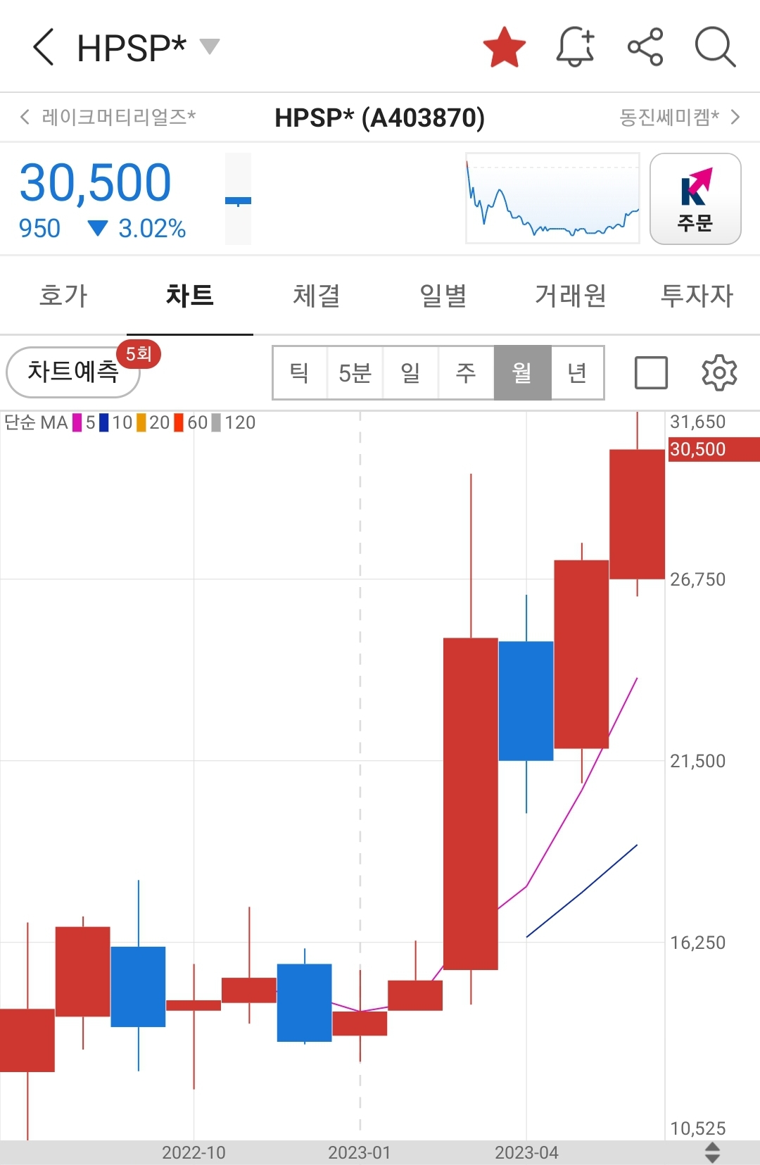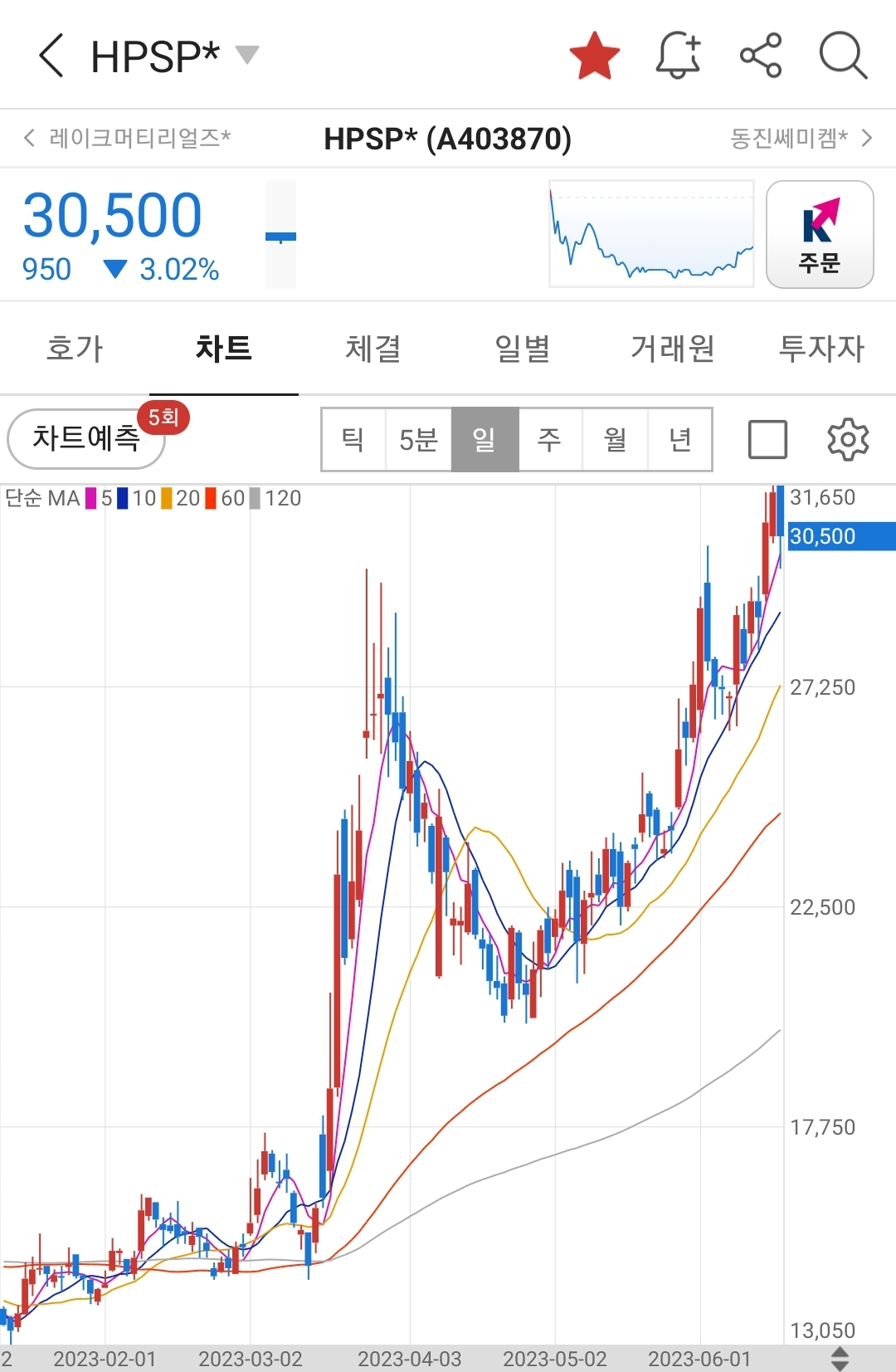 6월 12일 편입 발표가 난 날의 종가는 -3.65% 하락한 27,750원으로 마감되었습니다. 레이크머티리얼즈와 달리 편입 발표가 나면서 오히려 주간는 하락했습니다.