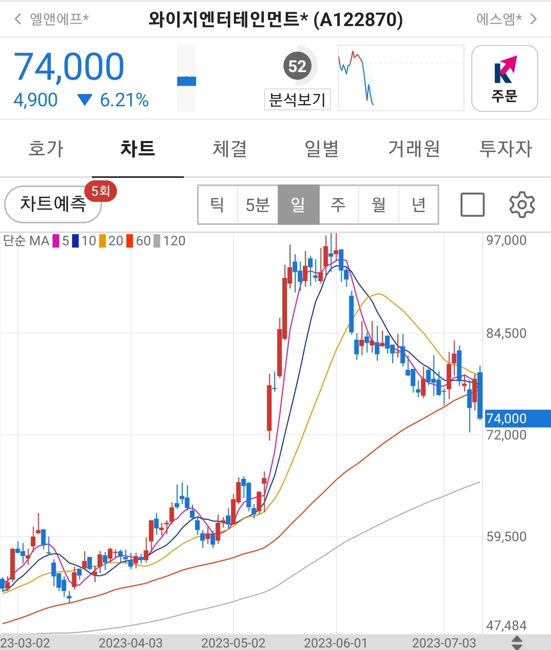 1. 와이지엔터테인먼트(122870) 장중 주가
